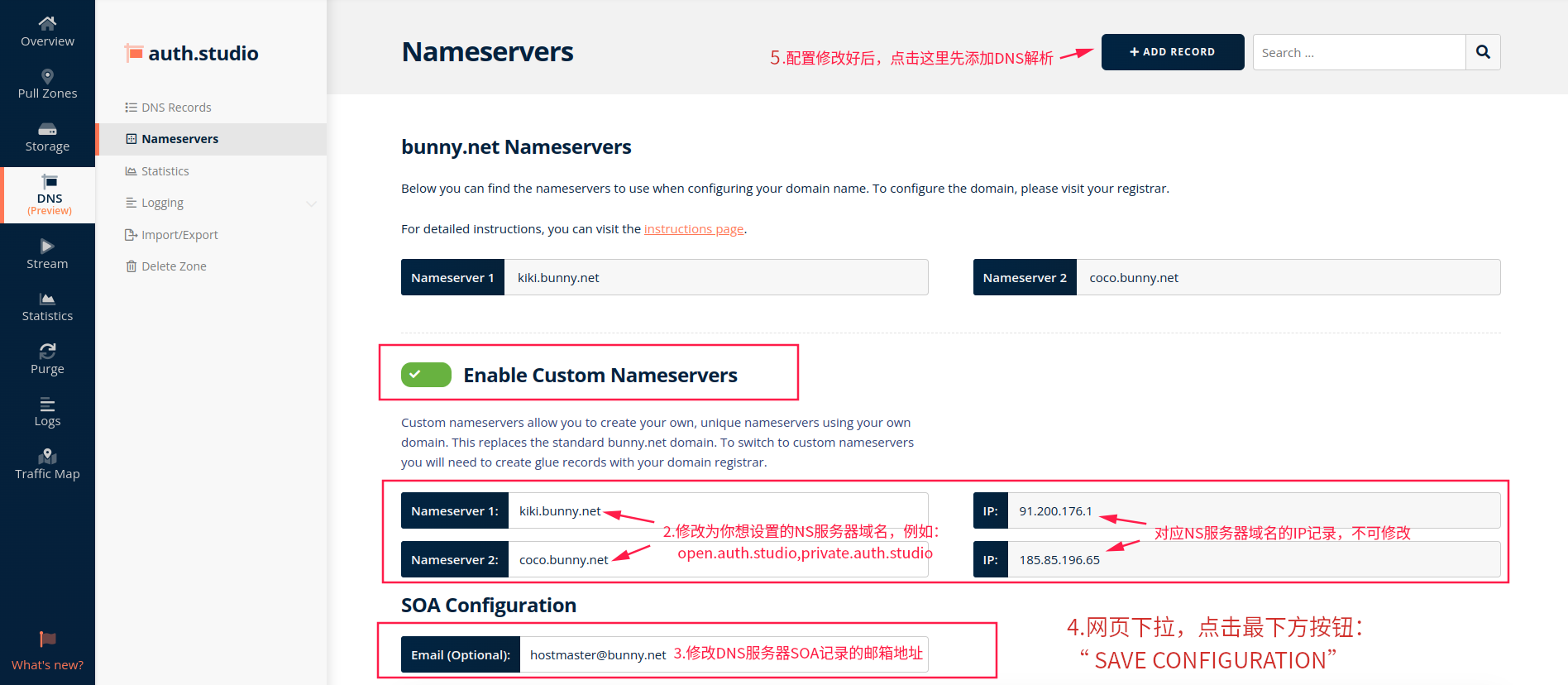 至此,BUNNY.NET这边的DNS配置基本完成,接下来就是去域名注册商添加自定义DNS服务器设置,大部分人这部分都应该会添加,不会的接着往下看,或者搜索引擎找教程。我的域名在Google注册,就以Google Domains后台为例。