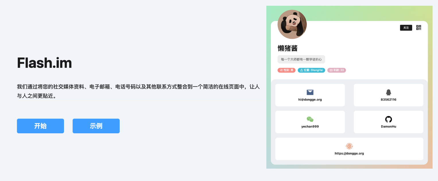通过 Flash.im可以聚合展示社交媒体资料、电子邮箱、电话号码以及其他联系方式。将这些整合到一个简洁的在线页面中,生成一个个人主页的链接。在开放的互联网中可以更方便的联系到你。会根据不同的链接类型跳转不同的类型